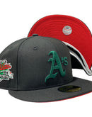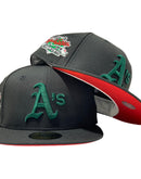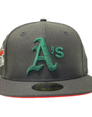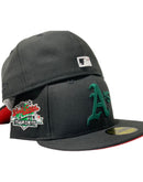 Custom NEW ERA fitted hat. all black cap. Front logo in green. 1989 world series side patch. red under visor. white sweat band. matching MLB logo man on the back