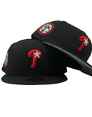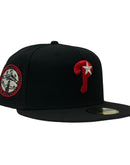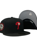 Introducing a unique custom Philadelphia Phillies gray brim New Era fitted hat from Sports World. The 59Fifty high crown fitted hat is designed with a sleek all black color cap that provides a bold contrast to the classic design.