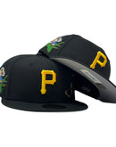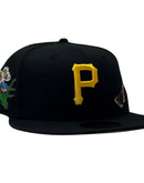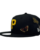 - Features an intricate Pittsburgh Pirates logo at the front with vibrant nature-inspired elements, including butterflies and floral motifs, across the crown.