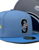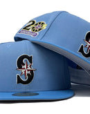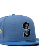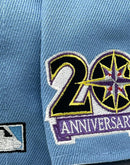 Presenting an exclusive "GameCube Collection" only from Sports World. 59Fifty high crown cap. Inspired by "Super Smash Bros" game, designed this Seattle Mariners cap. It features an all-light sky-blue color crown with ultra-blue visor. front logo in black with burgundy outline. 20th anniversary side patch on left mid panel in purple, light yellow, black and white outline. tonal new era flag on right mid panel. flat MLB batter man in the back. gray under visor. white sweat band. 100 percent polyester. Imported from China.