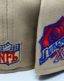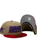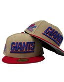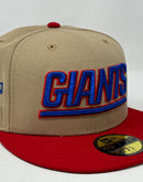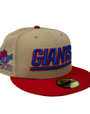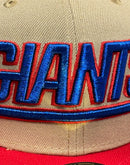 The hat is made of high-quality polyester and features a sleek all-camel color crown with a red visor. The front of the hat features the giants script logo in metallic royal with red outline, and the left mid panel has a 21st super bowl champions side patch. The back of the hat has a flat NFL logo.