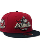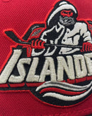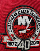 This custom New York Islanders 40th Anniversary Fitted New Era cap is a harmonious blend of classic design and modern detailing. The sleek red color cap with black visor makes it the perfect accessory for any occasion. The front Islanders logo, rendered in metallic silver, black and glow white exudes sophistication, while the 40th anniversary side patch adds a touch of nostalgic charm. Crafted with precision, this hat showcases the iconic NHL logo on the back, rounding off a design that pays tribute to sports heritage. Gray under visor and black sweatband enhance style and functionality, making it an ideal pick for collectors and enthusiasts alike.
