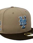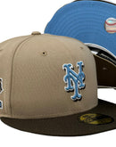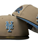 Presenting a custom New York Mets New Era fitted hat exclusively from Sports World. 59fifty high crown color cap. it features an all-camel color cap with brown visor. front logo in sky blue with brown and white outline. 40th anniversary side patch on left mid panel in metallic copper, brown and toast with white outline. tonal new era flag on right mid panel. Flat MLB batter man in the back. sky blue under visor. white sweat band. 100 percent polyester. imported from Bangladesh.
