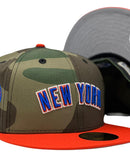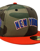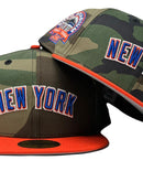 This 59Fifty high crown cap features a unique and stylish design, with an all-woodland camouflage color cap and a contrasting orange visor. The front logo is in metallic royal with orange and white outline, making it stand out from other Mets hats. The Shea stadium side patch on the left mid-panel adds a special touch to the hat, while the tonal New Era flag on the right mid-panel completes the design.