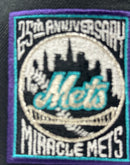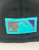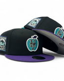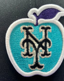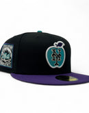 This 59Fifty high crown cap features a unique and stylish design, with an all-black color cap. The front apple logo is in teal, black and white, making it stand out from other Mets hats. The leaf in purple. The 25th anniversary side patch on the left mid-panel adds a special touch to the hat, while the tonal New Era flag on the right mid-panel completes the design.