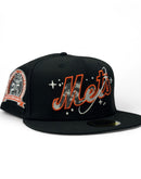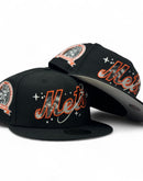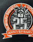This 59Fifty high crown cap features a unique and stylish design, with a black color cap. The front script logo in orange, metallic silver, black and metallic aluminum. The new 25th anniversary of Subway series side patch on the left mid-panel in various metallic color adds a special touch to the hat, while the tonal New Era flag on the right mid-panel completes the design.