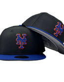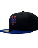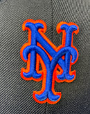 This 59Fifty high crown cap features a unique and stylish design, with an all black color cap with royal blue visor. The front team old school logo is in royal blue with white and orange outline, making it stand out from other Mets hats.