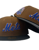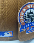 This 59Fifty high crown cap features a unique and stylish design, with a bronze color cap with black visor. The front logo is in metallic royal with toast and metallic copper outline, making it stand out from other Mets hats. The Shea stadium side patch on the left mid-panel adds a special touch to the hat, while the tonal New Era flag on the right mid-panel completes the design.