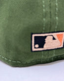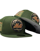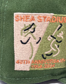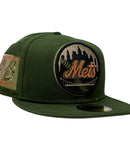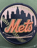 This 59Fifty high crown cap features a unique and stylish design, with an all-olive green color cap. The front logo in black, toast and olive green with copper logo, making it stand out from other Mets hats. The Shea stadium side patch on the left mid-panel adds a special touch to the hat, while the tonal New Era flag on the right mid-panel completes the design.