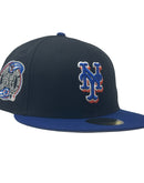 This 59Fifty high crown cap features a unique and stylish design, with an all-black color cap with royal blue visor. The front team old school logo is in royal blue with white and orange outline, making it stand out from other Mets hats. The subway side patch on the left mid-panel adds a special touch to the hat, while the tonal New Era flag on the right mid-panel completes the design.
