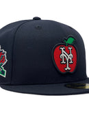 This 59Fifty high crown cap features a unique and stylish design, with an all-navy blue color cap. The front apple logo is in red, white, green with navy outline, making it stand out from other Mets hats. The 40th-anniversary side patch on the left mid-panel adds a special touch to the hat, while the tonal New Era flag on the right mid-panel completes the design.