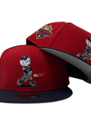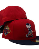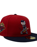 This 59Fifty high crown cap features a unique and stylish design, with a Red color cap and a contrasting Navy-blue visor. The front logo is in navy-blue, red and white making it stand out from other Mets hats. Baseball bat in metallic gold. 2023 old Timers day logo on the left mid-panel adds a special touch to the hat, while the tonal New Era flag on the right mid-panel completes the design.
