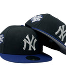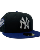 Introducing a unique custom New York Yankees 2000 world series gray brim New Era fitted hat from Sports World. The 59Fifty high crown fitted hat is designed with a sleek all black color cap with dark royal blue visor that provides a bold contrast to the classic design.