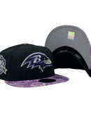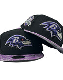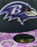 Introducing a unique custom Baltimore Ravens New Era fitted hat from Sports World. The 59Fifty high crown fitted hat is designed with a sleek all black color cap with a light purple paisley visor that provides a bold contrast to the classic design.