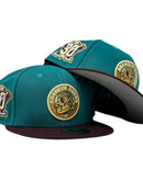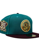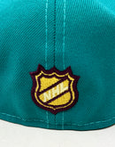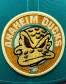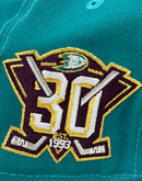 Celebrate three decades of hockey excellence with the Anaheim Ducks 30th Anniversary 59FIFTY New Era Fitted Hat. This expertly designed that combines timeless style with premium craftsmanship, making it a standout addition to any fan's collection. The bold turquoise color crown with maroon visor is complemented by striking metallic gold details, including the iconic Anaheim Ducks logo on the front and a meticulously embroidered 30th Anniversary side patch. Designed with comfort and durability in mind, this hat is perfect for showcasing your team's pride while maintaining a sleek and sophisticated look.