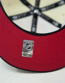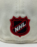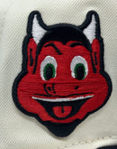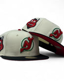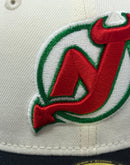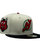New Jersey Devils mascot logo 59FIFTY New Era Fitted Hat. This expertly designed combines timeless style with premium craftsmanship, making it a standout addition to any fan's collection. The bold Off white color cap is complemented by a black visor, including the iconic Devils logo on the front in red, white and green and a meticulously embroidered mascot logo side patch. Designed with comfort and durability in mind, this hat is perfect for showcasing your team pride while maintaining a sleek and sophisticated look.
