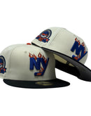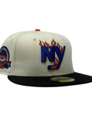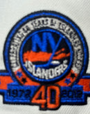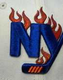 This custom New York Islanders 40th Anniversary Fitted New Era cap is a harmonious blend of classic design and modern detailing. The sleek, light-off-white colour cap features a black visor. Front blazing fire Ranger's logo in metallic royal blue with rust orange outline, while the 40th anniversary side patch adds a touch of nostalgic charm. Crafted with precision, this hat features the iconic NHL logo on the back, completing a design that pays tribute to sports heritage. Gray under visor and black sweatband enhance style and functionality, making it an ideal pick for collectors and enthusiasts alike.