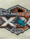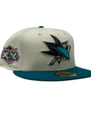 Celebrate the 20th anniversary with the San Jose Sharks 59FIFTY New EraĀ Fitted Hat. This expertly designed piece combines timeless style with premium craftsmanship, making it a standout addition to any fan's collection. A striking teal visor complements the bold off-white color cap. Designed with comfort and durability in mind, this hat is perfect for showcasing your team pride while maintaining a sleek and sophisticated look.