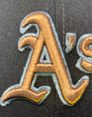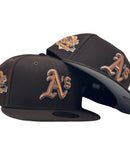 - High crown fitted hat in deep brown with metallic copper and pewter Oakland Athletics logo.