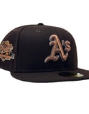 Introducing a unique custom Oakland Athletics 1989 world series gray brim New Era fitted hat from Sports World. The 59Fifty high crown fitted hat is designed with a sleek all dark brown color cap that provides a bold contrast to the classic design.