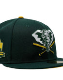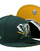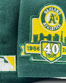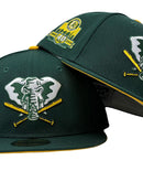 Introducing the Oakland Athletics 40th Anniversary "Stomper" Dark Green Taxi Yellow Brim New Era Fitted Hat, now available at Sports World 165. This custom New Era fitted hat is a must-have for any true Oakland Athletics fan. The 59Fifty high crown cap is designed with a sleek and modern look that will make you stand out in any crowd. The all-dark green color cap is complemented by a front Elephant logo in green and white, with a baseball bat in yellow and black outline. The 40th-anniversary side patch in yellow, green, and white is a special touch that adds to the exclusivity of this hat. The tonal new era flag on the right mid-panel and the flat MLB batter man in the back complete the look. The yellow undervisor and white sweatband add a pop of color and provide additional comfort. Made from 100% polyester, this hat is durable and perfect for everyday wear.