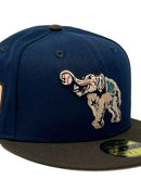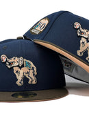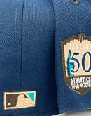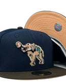 Presenting an exclusive custom Oakland Athletics New Era fitted only from Sports World. 59Fifty high crown cap. it features an all-light navy color cap with brown visor. Front Athletics Big Elephant logo in peach with navy and black outline. Baseball in white with orange stitching. 50th anniversary side patch in left mid panel. Tonal New Era flag on right panel. Flat MLB batter man in the back. peach under visor. white sweat band. 100 percent polyester. imported from China.