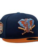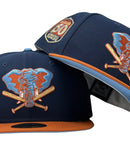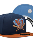 Presenting an exclusive custom Oakland Athletics New Era fitted only from Sports World. 59Fifty high crown cap. It features an all-light navy color cap with rust orange visor. front logo in sky blue and rust orange. baseball bat in toast with rust outline. 50th anniversary side patch on left mid panel. tonal new era flag on right mid pane. Flat MLB batter man in the back. sky blue under visor. white sweat band. 100 percent polyester. imported from China.
