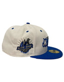 Custom new era wool fitted. all white cap with royal blue visor. 1997 all star side patch. gray under visor. script logo on the back.