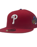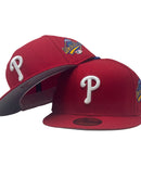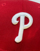 Introducing a unique On field Philadelphia Phillies gray brim New Era fitted hat from Sports World. The 59Fifty high crown fitted hat is designed with a sleek all red color cap that provides a bold contrast to the classic design.