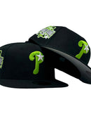 Introducing a unique custom Philadelphia Phillies gray brim New Era fitted hat from Sports World. The 59Fifty high crown fitted hat is designed with a sleek all black color cap that provides a bold contrast to the classic design.