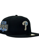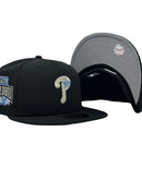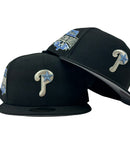 Introducing a unique custom Philadelphia Phillies gray brim New Era fitted hat from Sports World. The 59Fifty high crown fitted hat is designed with a sleek all black color cap that provides a bold contrast to the classic design.