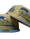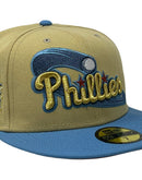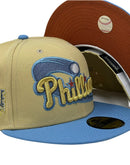 Presenting an exclusive custom Philadelphia Phillies "Sunrise Gradient 2" New Era fitted hat only from Sports World. 59Fifty high crown cap. It features an all-Vegas gold color crown with sky blue visor. front script Phillies logo in metallic gold with light navy with sky blue outline. 1996 all-star game side patch on left mid panel in sky blue with metallic gold outline. tonal new era flag on right mid panel. flat MLB batter man in the back. rust orange under visor. white sweat band. 100 percent polyester. Imported from Bangladesh.