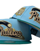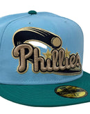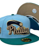 Introducing a unique custom Philadelphia Phillies camel brim New Era fitted hat from Sports World. The 59Fifty high crown fitted hat is designed with a sleek all sky-blue color cap with turquoise visor that provides a bold contrast to the classic design.