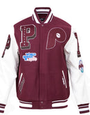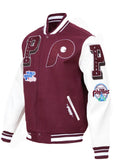 Lined with quilting collar that stands up two pockets in front two pockets inside hefty coat appropriate for chilly weather appliqué that is heat-sealed and has elevated embroidery detail Heat-sealed chenille detail on felt applique 100% Polyester: full zip with snap overlays at the top and bottom.