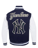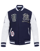 Quilted lining Stand-up collar Two front pockets Two interior pockets Heavyweight jacket suitable for cold temperatures Heat-sealed applique with raised embroidered detail Heat-sealed felt applique with chenille detail Faux leather sleeves and trim Full-zip with top and bottom snap overlay Material: 100% Polyester