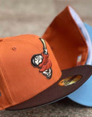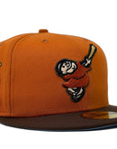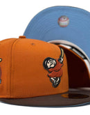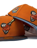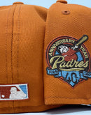 Orange San Diego Padres 40th Anniversary New Era fitted hat from Sports World. 59Fifty high crown cap. Front logo toast and rust orange with brown outline. 40th anniversary side patch on right mid panel. Tonal new era flag on left mid panel. Flat MLB batter man in the back. Sky blue under visor. White sweat band. 100 percent polyester. Imported from Bangladesh.