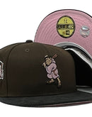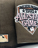 Presenting an exclusive custom 1992 All-star game San Diego Padres New Era fitted hat only from sports world. 59Fifty high crown cap. It features an all-walnut/ brown color cap with black cord visor. Front logo in pink, black and metallic copper. 1992 all-star game side patch on left mid panel. tonal new era flag on right mid panel. flat MLB batter man in the back. pink under visor. white sweat band. Crown in 100 percent polyester and visor in 100 percent cotton. imported from China.