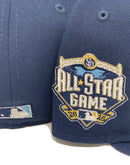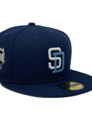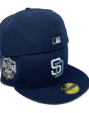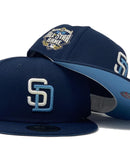 Rep you team with custom new era fitted hat exclusively at Sports World. 59fifty new era high crown fitted. It features all navy blue cap. front logo "S" in white and "D" in sky blue. 2016 all star game side patch in white with navy background with metallic gold outline. Matching flat MLB batter man in the back. sky blue under visor. white sweat band. it features 100 percent polyester. Made is Bangladesh.