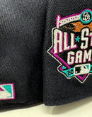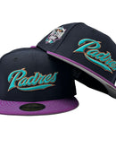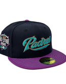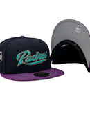 Introducing a unique custom San Diego Padres gray brim new era fitted hat from Sports World. The 59Fifty high crown fitted hat is designed with a sleek all navy blue color crown and a stylish grape visor that provides a bold contrast to the classic design.