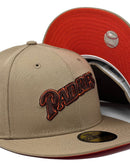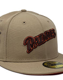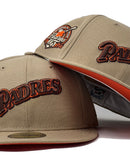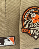 Presenting an exclusive custom script Padres 40th anniversary New Era fitted hat from Sports World. 59Fifty fitted hat. it features all camel color cap. front script Padres logo in brown with orange outline. 40th anniversary side patch on left mid panel. tonal new era flag on right mid panel. flat MLB batter man in the back. orange under visor. white sweat band. 100 percent polyester. imported from China.