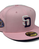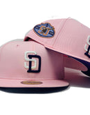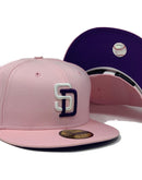 Custom new era fitted hat. all light pink cap. front logo "S" in white and 'D' in purple. 50th anniversary side patch in purple with copper outline. Flat MLB batter man in the back. purple under visor. white sweat band. 100 percent cotton.