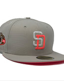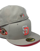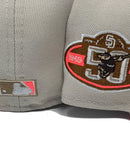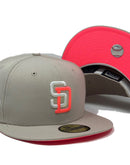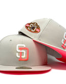 Custom new era fitted hat. all stone color cap. front logo "s" in white and "d" in neon pink. 50th anniversary side patch. flat MLB batter man in the back. neon pink under visor. white sweatband. 100 percent polyester.