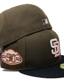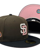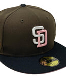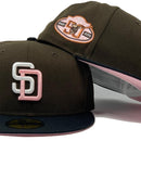 Custom new era fitted. all brown cap with black visor. front logo "S" in white and "D" in pink. 50th anniversary side patch in pink with metallic copper outline. Matching flat MLB batter man in the back. pink under visor. it features 100 percent polyester.