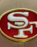 The hat is made of high-quality polyester and features a sleek all-camel color crown with a red visor. The front of the hat features the 49ers logo in red, white and metallic gold outline, and the left mid panel has a 30th anniversary side patch. The back of the hat has a flat NFL logo.
