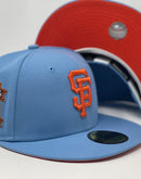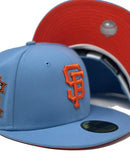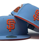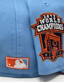Presenting an exclusive custom San Francisco Giants New Era fitted hat from Sports World. 59Fifty high crown cap. it features an all-sky blue color cap. front logo in orange. 2012 world series champions side patch on right mid panel. Tonal new era flag on right mid panel. flat MLB batter man in the back. orange under visor. white sweat band. 100 percent polyester. imported from Bangladesh.