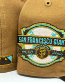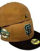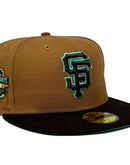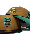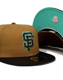 presenting an exclusive "mint chocolate collection part 2" only from Sports World. 59Fifty high crown cap. it features all bronze color crown with brown visor. front logo in brown with mint color outline. 2000 inaugural season side patch in brown and toast with mint outline. tonal new era flag on right mid panel. flat MLB batter man in the back. mint color under visor. white sweat band. Crown in 100 percent cotton and visor in 100 percent polyester. imported from Bangladesh.
