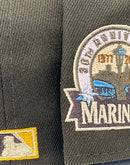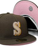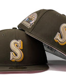 Presenting an exclusive "Mocha" collection, Seattle Mariners 30th anniversary pink brim New Era fitted only from Sports World. 59Fifty high crown cap. It features an all-brown color cap. front Big capital S logo in toast with metallic gold and pink outline. 30th anniversary side patch on left mid panel in brown, beige, pink and sky blue. tonal new era flag on right mid panel. flat MLB batter man in the back. pink under visor. white sweat band. 100 percent polyester. Imported from China.