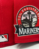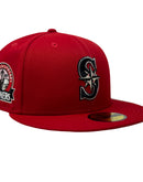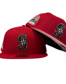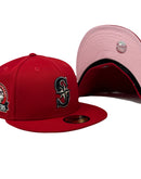 Introducing a unique custom Seattle Mariners pink brim New Era fitted hat from Sports World. The 59Fifty high crown fitted hat is designed with a sleek all red color cap that provides a bold contrast to the classic design.