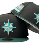 Introducing the Seattle Mariners Kingdome Stadium Black Dark Green Visor Gray Brim New Era Fitted Hat, a must-have accessory for baseball fans everywhere. This exclusive design from Sports World 165 is sure to turn heads with its sleek, modern look and high-quality construction. Made with the best possible materials, this 59Fifty high crown cap is comfortable and durable, perfect for wearing to games or just out and about.
