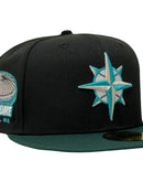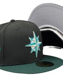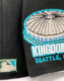 This hat features an all-dark green color cap with a green visor and gray brim for a unique and stylish look. The team's original compass logo in teal and metallic silver is prominently displayed on the front, while a baseball in white with a teal outline adds a pop of color. On the left mid-panel, the iconic Kingdome stadium side patch is showcased, paying homage to the team's history. The right mid-panel features a tonal New Era flag, and the back has a flat MLB batter man. The gray undervisor helps reduce glare, while the white sweatband keeps you cool and comfortable.
